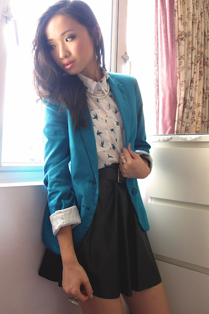 I'm wearing an extremely light-weight blouse from Dressabelle. I was mesmerized by the turquoise swallows against the white. Such a refreshing combination! A turquoise blazer matched perfectly, bringing even more emphasis to the turquoise swallows. Lastly, basic leather swing skirt provided texture. Black as a neutral colour which toned down my outfit, making it more wearable for day time. I apologize for not showing you guys my shoes! My room is a small space to work in. But if you're wondering, I would wear this outfit with black chunky heels or mary-jane flats.