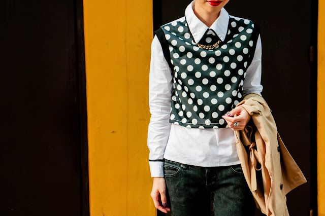 The unique combination of polka dots and contrast piping on the shirt is graphical and playful. As much as I appreciate plain basics, patterns never fail to add a little something to my outfit. Polkadots dominated many of Rei Kawakubo's works and hence and I think the overall look of this outfit reminded me of her. I couldn't help but to add a necklace whenever I'm wearing collared shirts. The subtle peek of jewelry is strangely satisfying. Who else is guilty of this?