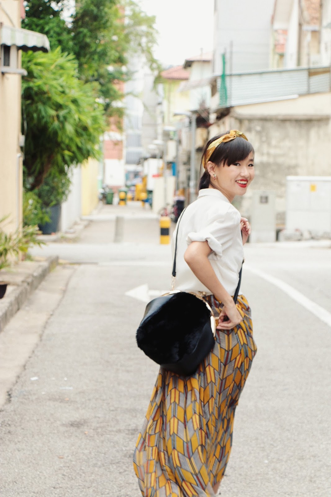 I discovered a whole new colour palette that works now, and I have gravitating a lot towards white (awesome contrast against the tan), earthy tones and mustard. I consider mustard to be a tricky colour, because it is neither saturated nor bright...a dusty yellow that no one knows how to deal with. But over time, it began to grow on me because it has that vintage aged appeal. I love the seventies inspired print on my long dress and layered a vintage blouse over it with sleeves rolled up to keep things casual. I thought the dainty collar and double buttoned panel on the blouse really amped up the vintage vibe. I kept the overall colour scheme rather consistent, then threw on the cutest faux fur bag to complete the look. In a way, my outfit looks very granny chic! Snap-closure bags remind me of coin purses people used to store their change in, and it looks absolutely adorable when enlarged in size. Wearing vintage earrings and silk scarf that are hand me downs from my mom, I felt like as if I went back in time. Someone take me to good ol' picnic date now!